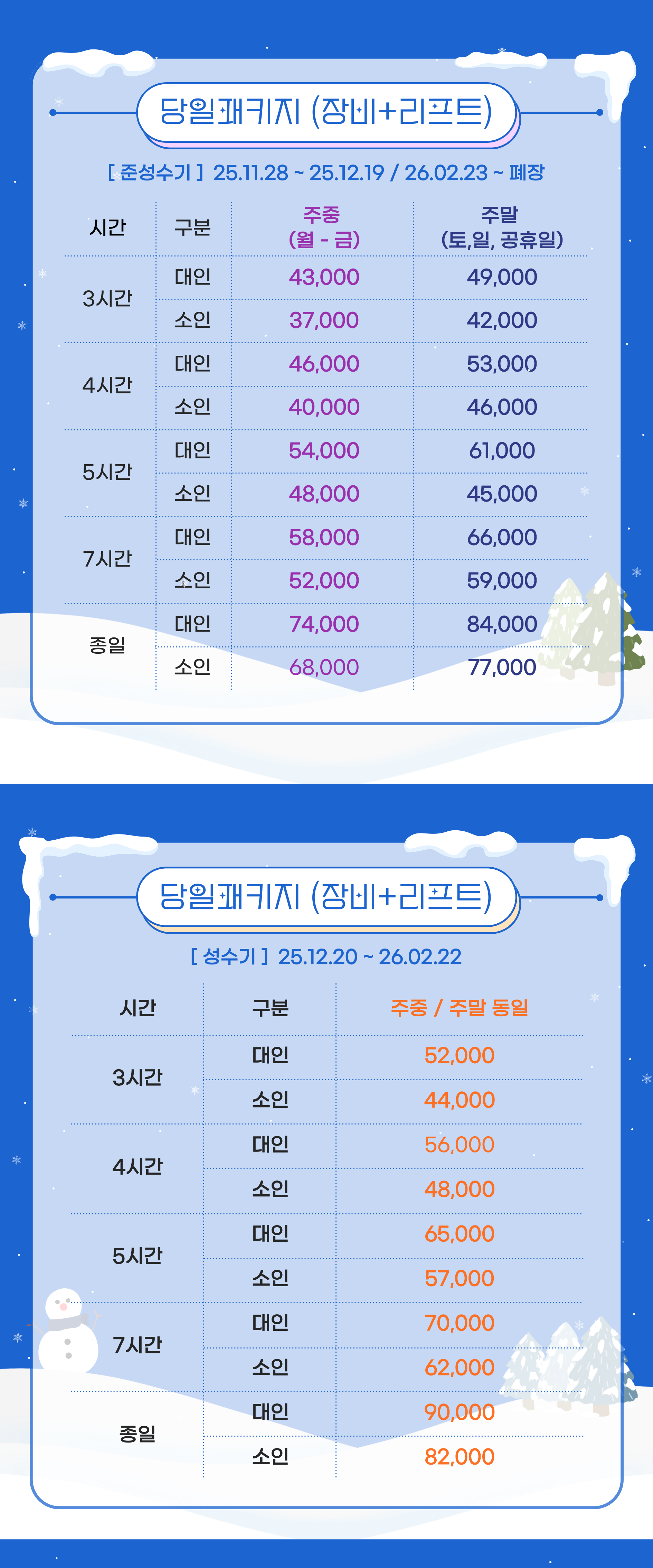 장비는 스키 또는 보드 세트 (부츠포함)입니다.