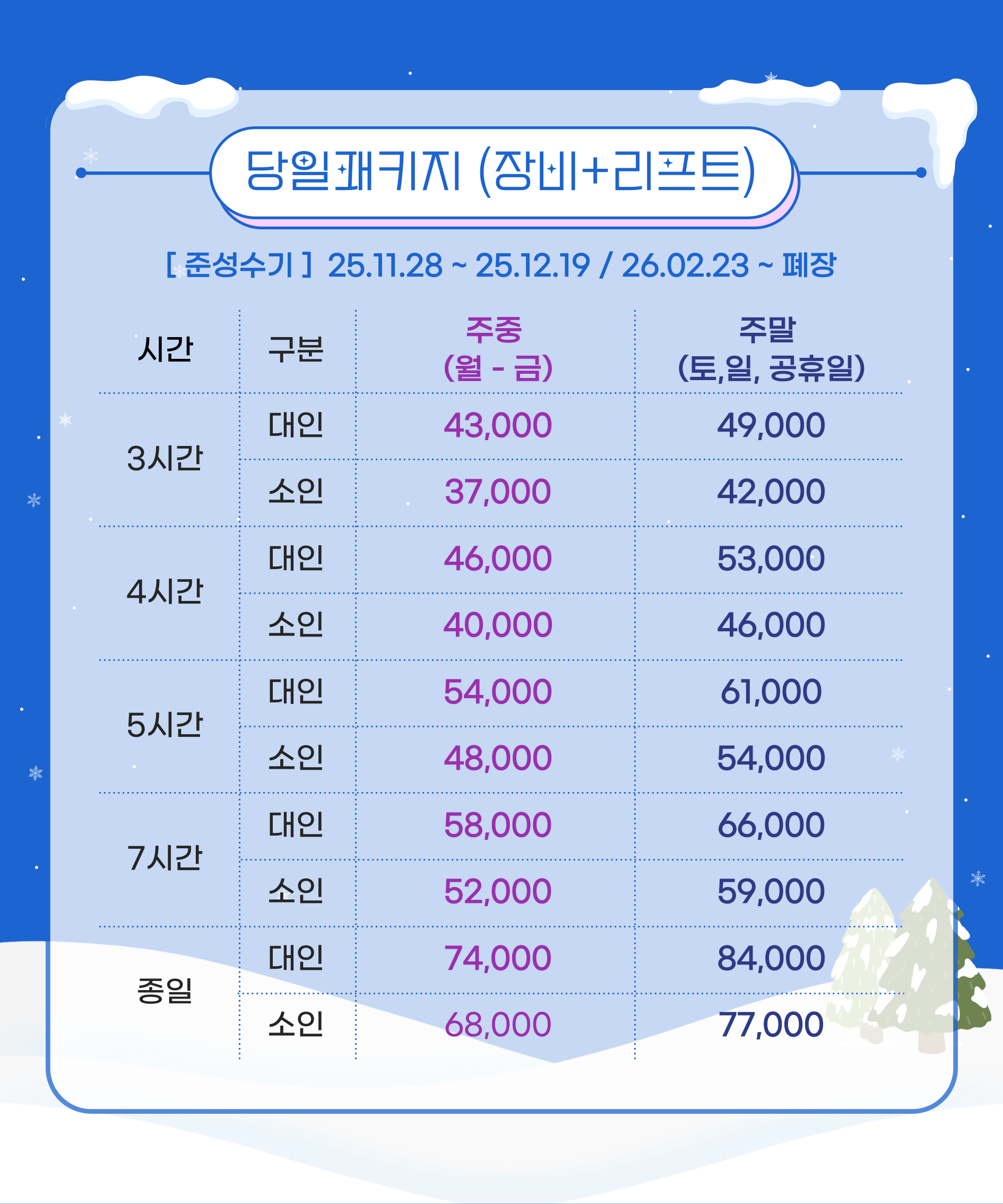 장비는 스키 또는 보드 세트 (부츠포함)입니다.